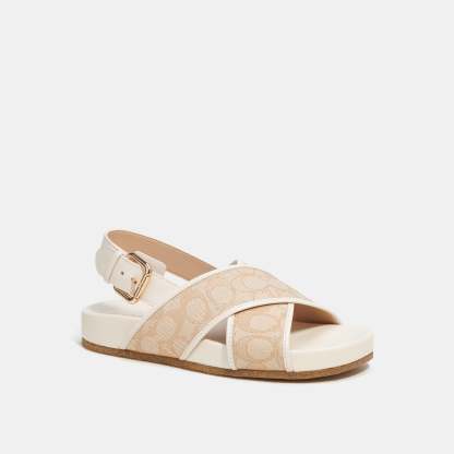 Signature jacquard and leather upper Man-made leather lining and footbed Rubber outsole Buckle closure This piece is crafted of our Signature jacquard made from a blend of organic cotton and recycled polyester Style No. CI059 | Outlet Adora Sandal In Signature Jacquard - Beige, Size - 5